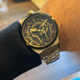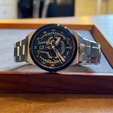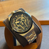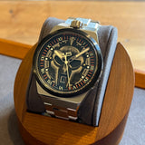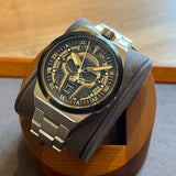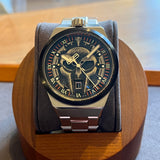 Průměr 43 mm. Pouzdro a náramek z nerezové oceli. Hladký černý ocelový rám. Ciferník s lebkou a římskými číslicemi. Svítící ručičky a značky. Safírové sklíčko. Quartz strojek. Pevná ocelová zadní část pouzdra. Dvojitá skládací ocelová spona s nálepkou.