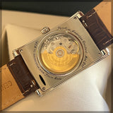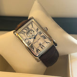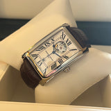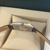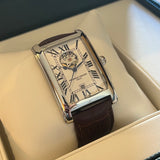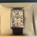 Průměr 38.7 mm * 30.7 mm. Tloušťka 10.2 mm. Šířka oka 18 mm. Pouzdro z nerezové oceli. Bílý ciferník s římskými číslicemi a otevřeným srdcem na 12. hodině. Modré jehly. Automatický strojek na základě kalibru ETA 2824-2. Zadní průhledné pouzdro. Hnědý kožený náramek a výměna spony není originální. Frédérique Constant pin spona a 1 další.