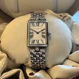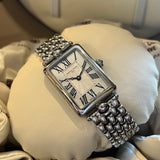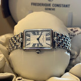 Průměr 28 mm * 20.70 mm. Tloušťka 6.98 mm. Velikost zápěstí 15 cm. Pouzdro a náramek z oceli. Luneta z hladké oceli. Bílý a stříbrný ciferník s perleťovým a gilošovaným povrchem. římské číslice. Quartz strojek. Masivní ocelová zadní strana pouzdra s emblémem Frédérique Constant. Ocelová dvojitá skládací spona s vyrytým Frédérique Constant.