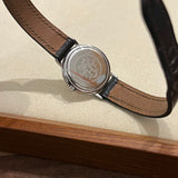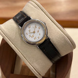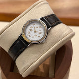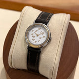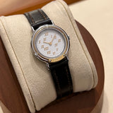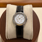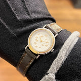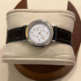 Průměr 24 mm. Pouzdro z nerezové oceli. Hladká pozlacená luneta. Bílý ciferník se zlatými římskými číslicemi. Safírové sklo. Quartz strojek. Masivní dýnko z nerezové oceli s nálepkami a... Hermès znak. Originální hnědá Hermès Kožený řemínek v dobrém stavu. Originální zlato. Hermès spona na špendlík.