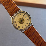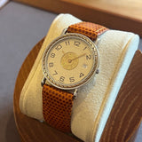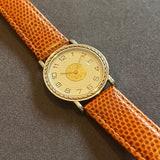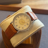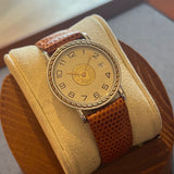 Průměr 32 mm. Pouzdro z nerezové oceli. Krémový ciferník s římskými číslicemi. Lumincentní ručičky. Safírové sklo. Quartz strojek. Samolepka po celé ploše pouzdra s... Hermès Emblém. Neoriginální hnědooranžový náhradní kožený řemínek. Náhradní pozlacená ocelová spona.
