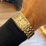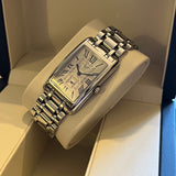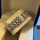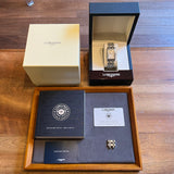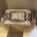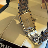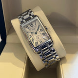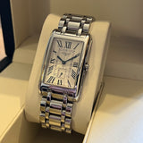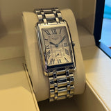 Rozměry: 23.30 mm * 37 mm. Obvod zápěstí 16.5 cm bez dvou dalších článků. Pouzdro a náramek z nerezové oceli. Rám z hladké oceli. Stříbrný gilošovaný ciferník s římskými číslicemi. Modré ruce. Safírové sklíčko. Quartz strojek. Masivní ocelová zadní strana pouzdra s emblémem Longines. Dvojitá skládací ocelová spona s emblémem Longines.