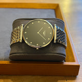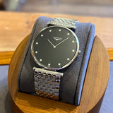 Průměr 37 mm. Obvod zápěstí 18 cm. Pouzdro a náramek z nerezové oceli. Luneta z hladké oceli. Černý ciferník s diamantovými indexy. Safírové sklíčko. Quartz strojek. Masivní ocelová zadní strana pouzdra s emblémem Longines. Dvojitá skládací ocelová spona s emblémem Longines.