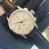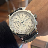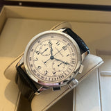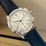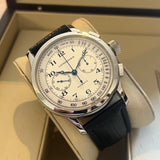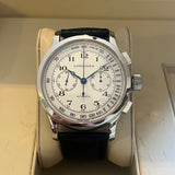 Průměr 47.5 mm. Pouzdro z nerezové oceli. Bílý a stříbrný ciferník s arabskými číslicemi. Modré ocelové ruce. Safírové sklíčko. Automatický pohyb chronografu. Ráže L750-2. 46hodinová rezerva chodu. Zadní strana vnějšího pouzdra v důstojnickém stylu. Průhledné vnitřní zadní pouzdro se safírovým sklíčkem. Náhradní černý kožený řemínek není originální. Originální spona Longines.
