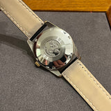 Průměr 34 mm. Pozlacené pouzdro z nerezové oceli. Hladká pozlacená luneta z nerezové oceli. Stříbrný ciferník bez číslic. Zlaté ručičky. Automatický strojek. Masivní dýnko z nerezové oceli s Omega emblém. Náhradní černý kožený řemínek, neoriginální. Pozlacená spona z nerezové oceli s Omega symbol.