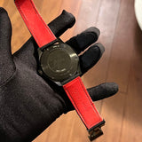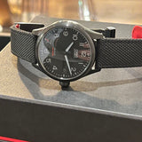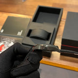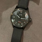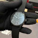 Průměr 45 mm. Vstupní rohy 22 mm. Cadran noir. Chiffres et aiguilles recouverts de Superluminova gris. Boîtier en acier s oživením DLC noir. Textilní náramek noir, boucle déployante revêtu de DLC noir.
