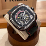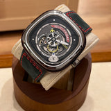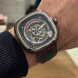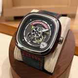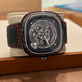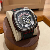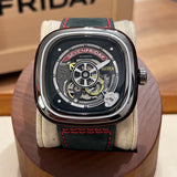 Průměr 47 mm. Pouzdro z nerezové oceli. Rám z hladké oceli. Skeletový ciferník bez číslic. Svítící ruce. Safírové sklíčko. Automatický pohyb. Masivní ocelová zadní strana pouzdra s emblémem Seven Friday. Černý kožený pásek Seven Friday. Ocelová spona s emblémem Seven Friday.