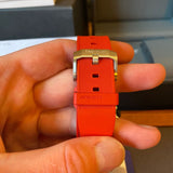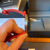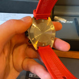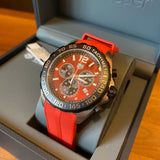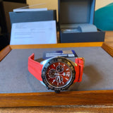 Průměr 43mm. Tloušťka 12.4 mm. Mezi očky 21.5 mm. Vodotěsné 200 metrů. Saténové ocelové pouzdro. Pevná ocelová luneta potažená černým PVD. Pevné ocelové pouzdro. Šroubovací korunka z oceli s PVD povlakem. Červený ciferník, chronograf datum. Quartz strojek. Červený gumový pásek. Ocelová spona.