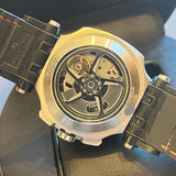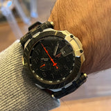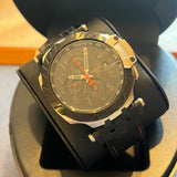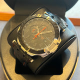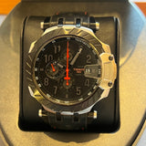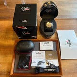 Průměr: 45 mm. Pouzdro z nerezové oceli. Ocelová luneta s černým PVD povlakem. Černý ciferník s arabskými číslicemi. Malé ručičky a ručička chronografu v červené barvě. Safírové sklíčko. Automatický pohyb. Ráže 13 1/4. Rezerva chodu 45 hodin. Zadní průhledné pouzdro. Černý kožený a gumový pásek Tissot. Špendlíková přezka s emblémem Tissot.