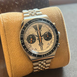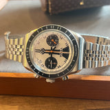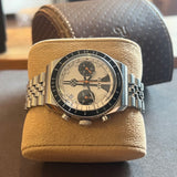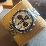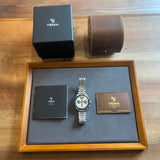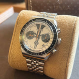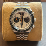 Průměr 39 mm. Tloušťka 14 mm. Pouzdro a náramek z nerezové oceli. Otočná luneta s kilometrovou stupnicí. Bílý ciferník bez čísel. Luminiscenční ručičky a indexy. Safírové sklo. Automatický chronografický strojek. Ráže ETA 7753. Jubilejní náramek jiného výrobce. Masivní dýnko s Yema emblém. Šroubovací korunka s Yema symbol.